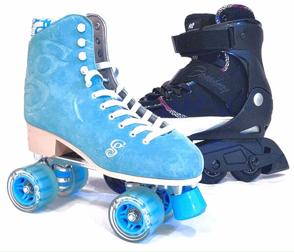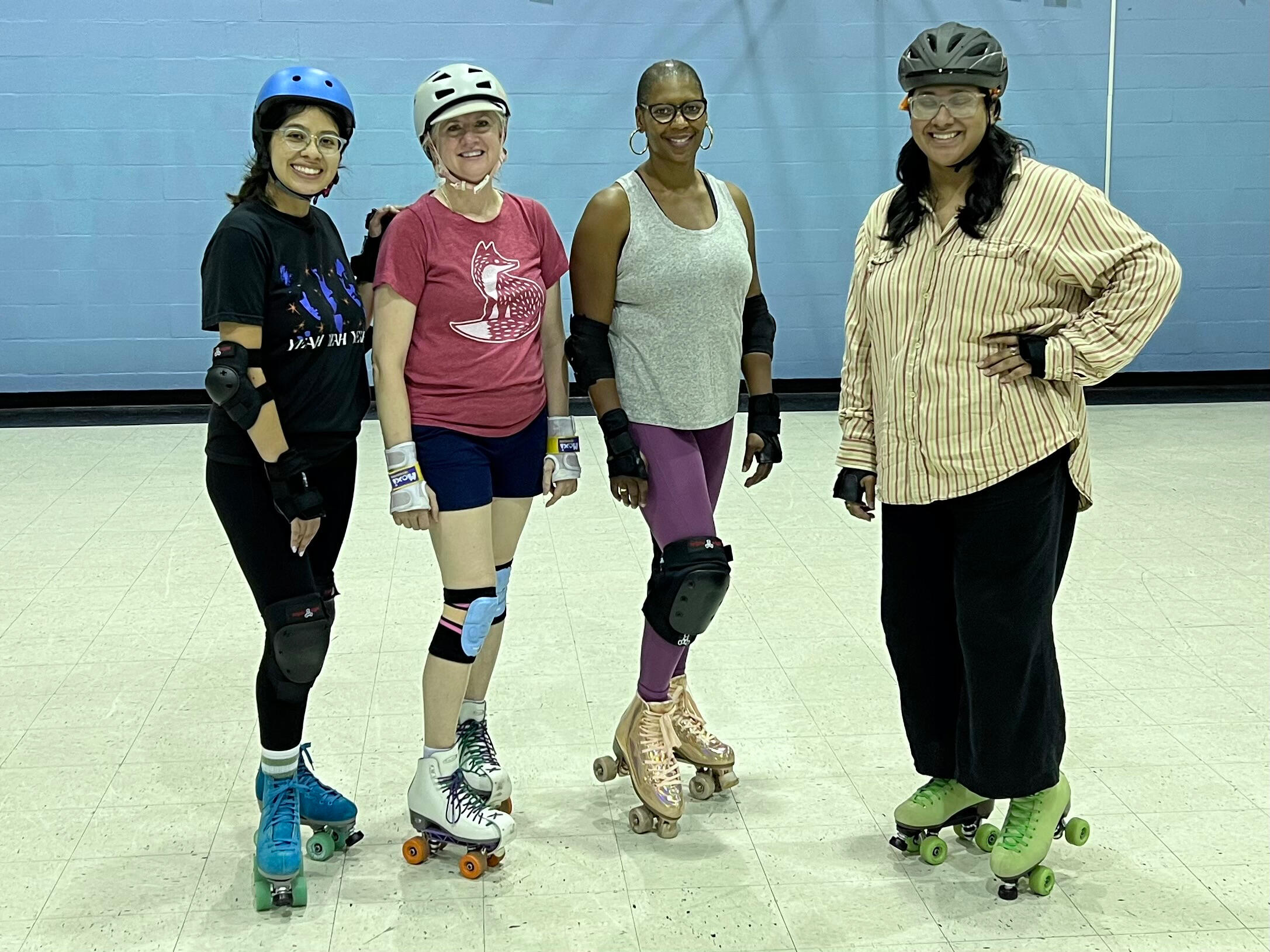 Start with the clinic if you are learning to skate or need a refresher. We have loaner skates & protective gear available.